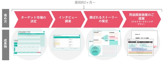 ターゲット市場の選定やインタビュー調査を含めた用途探索の計画から、テストマーケティング施策のご提案までを最低約2ヵ月で実行できるため、スピーディな用途開発のご支援を可能としています。