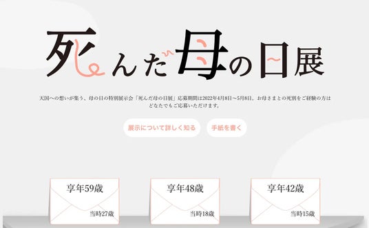 「死んだ母の日展」は、亡き母へ宛てた手紙を匿名で投稿・公開できるオンライン展示です。2021年の開始以来、これまでに2,000通を超える手紙が寄せられており、2026年も開催されます。