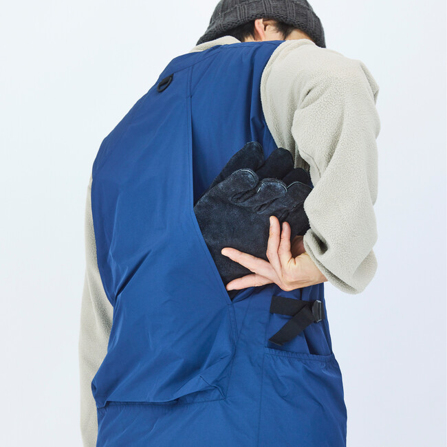 収納力と保温性に優れたキャンプシーン向け中綿入りベスト。表地にはシワになりにくいSOLOTEX(R)素材、中綿はGRS認証リサイクル素材COMFORTEMP(R)を採用。 側面にワンドポケットを搭載した事でペットボトルなどの収納を可能とし、サイドに配置したアジャスターは収容物の固定を可能とするのみではなく、身幅の調整機能も可能に。背面の大容量ポケットは、容易に物の出し入れが可能、大小様々な5個のポケットを配し、小物類の収納に便利。