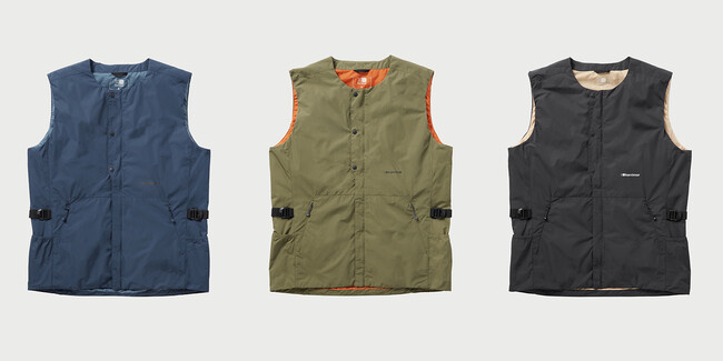 「camp insulation vest (キャンプ インシュレイション ベスト)」大小様々なポケットを5個配し、中綿にはリサイクル素材〈COMFORTEMP(R)〉を使用した収納力と保温性に優れたキャンプシーン向けのベスト。
