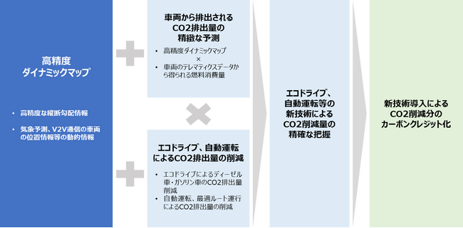 気候変動対策に関して先進的な取り組みが進む欧州において、ダイナミックマップを活用した、中・大型車両から排出されるCO2排出量の精確な予測とエコドライブ及び自動運転等先進技術の高度化を実現し、CO2削減効果を精確に算出していく流れ(高精度CO2排出量削減手法)を確立することを目指します。