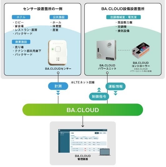 「BA CLOUD」は、換気状態を監視し自動制御するIoTソリューションです。累計1,000ヶ所以上に導入実績のあるCO2濃度・温度・湿度の複合センサーにより室内の人の減少や不在を検知し、人がいない時の無駄な換気をカットします。1契約で、1部屋だけの小規模な店舗から15階建程度のビルまでカバー可能で、平均的な200室程度のホテルであれば、1店舗あたり年間数百万円単位での電気代(又はガス代等空調費)削減が期待できます。料金体系は、削減できた電気代の一部をいただくモデルのため、導入に伴う新たなコストが発生しません。また、換気状態を監視する中で、換気設備の故障や老朽化なども検知できるのが特長です。