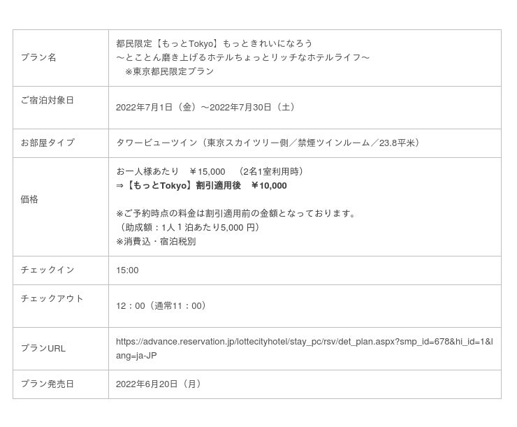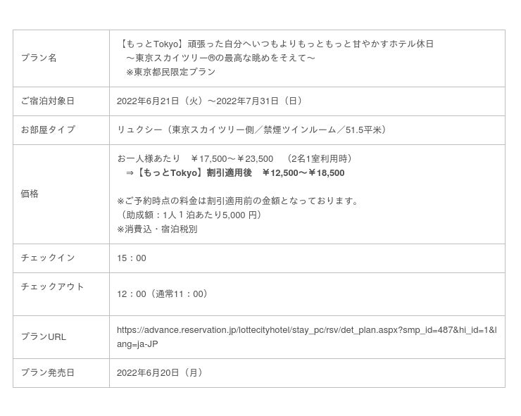 ロッテシティホテル錦糸町(東京都墨田区錦糸4-6-1 代表取締役社長:福井朋也)は、東京都及び東京観光財団が実施する都内観光促進事業「もっと楽しもう!TokyoTokyo」(略称「もっとTokyo」)の再開に伴い、