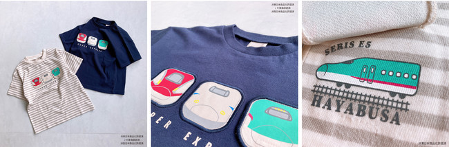 ●〈Dr.イエロー〉〈ハヤブサ〉の疾走感あふれるグラフィックにステッチをあしらい、プティマインらしいニュアンスカラーに仕上げました。