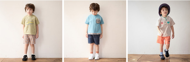 左から、ニュアンスカラーのお出かけスタイル、普段使いで定番のデニムスタイル、明るいカラーを加えたアウトドア向けのアクティブスタイルなど、子どもたちの生活の色々なシーンにマッチするスタイル提案ができる、プティマインならではのデザインです。