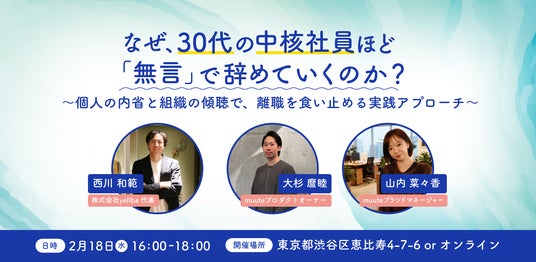 Nissay MIRAIQA株式会社(本社:東京都渋谷区、代表取締役社長:関 正之)が運営するAIジャーナリングアプリ「muute」と、社員のホンネを起点に採用力・定着力を高める組織改善クラウドサービスを展開する株式会社yellba(本社:東京都港区、代表取締役:西川 和範)は、2026年2月18日(水)16:00より、共催イベント『なぜ、30代の中核社員ほど「無言」で辞めていくのか? ~個人の内省と組織の傾聴で、離職を食い止める実践アプローチ~』を、弊社オフィス(恵比寿)およびオンラインにて開催いたします。