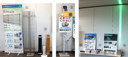 1. テトラフェンス 2. プロテクトボラード 3. 横断者注意喚起灯「ゆずるくん」 4. 小型IoT水位センサ5. スマート道路鋲 6. プロジェクションガイド