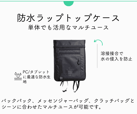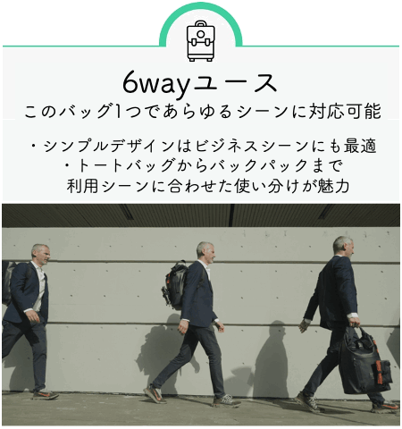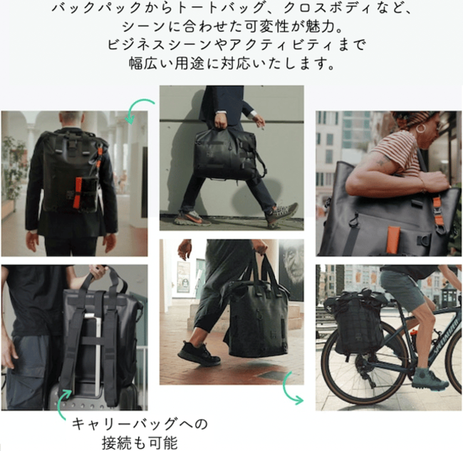 ビジネスに最適なトートバッグから、アウトドアで活躍可能なバックパックまでその場で変身可能。バッグに悩む日々はもう終わりです。