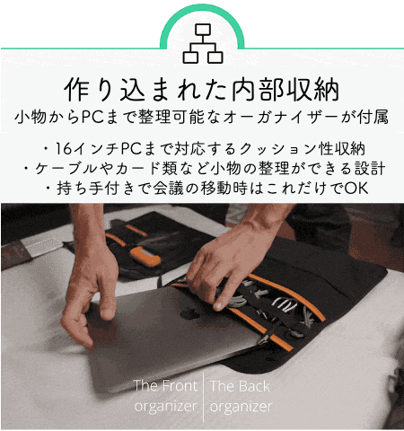 PCやノートの収納に適しており、会議室への移動や、カフェでのちょっとした作業はこれ一つで十分です。