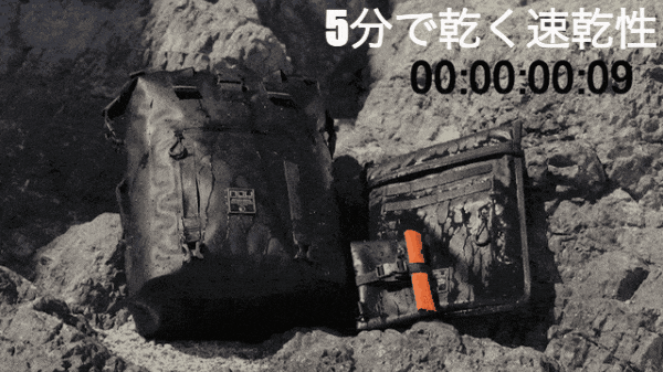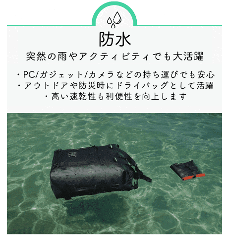 Levante最大の魅力はその防水性。突然の雨でもバッグの中身を濡らす心配はありません。また、速乾性も備えているため、突然の雨で濡れてしまった際やアウトドアでの利用の際にも安心です。