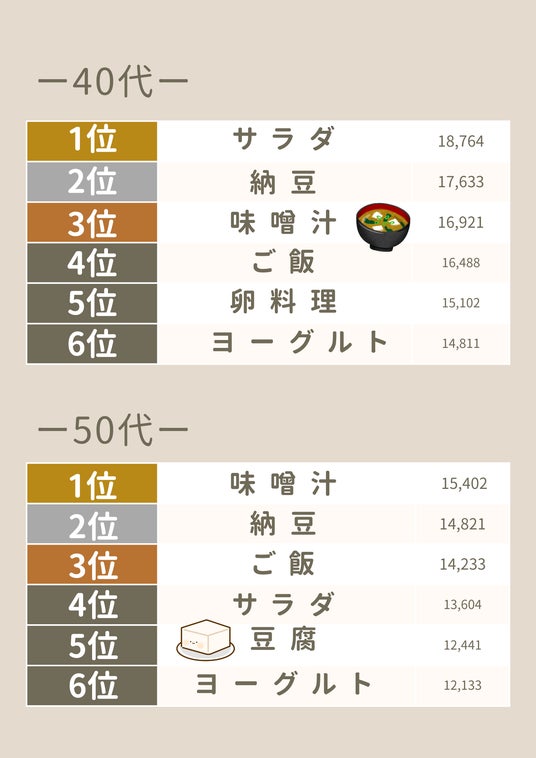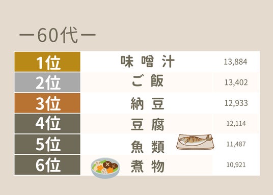 「味噌汁」「ご飯」「納豆」「豆腐」「魚類」など、和食の王道がずらりと並びました。消化にやさしい「煮物」、油分を控えた「漬け物」など他の年代には見られなかった食品がランクインしており、まさに“体を整える”ことを意識した食生活がうかがえます。
