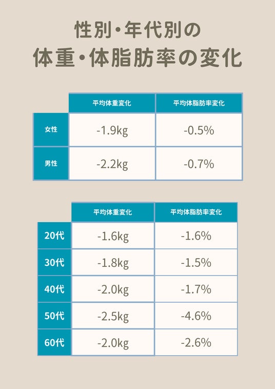 今回の集計では、50代を除くすべての年代で、体重・体脂肪率の両方において減少傾向が見られました。特に40代と60代以上では、体重・体脂肪率ともに大きな改善が確認されており、年齢を重ねても適切な食習慣によって確かな成果が得られることが示されています。一方で、50代は体重の減少こそ見られるものの、体脂肪率が大幅に増加しており、筋肉量の減少や代謝の低下による“隠れ肥満”の可能性も示唆されます。「体重の数字」だけでなく、「体組成の質」に注目したアプローチが重要。タンパク質摂取の最適化など、筋肉量の維持・向上を意識した食習慣が、より効果的な成果につながると考えられます。