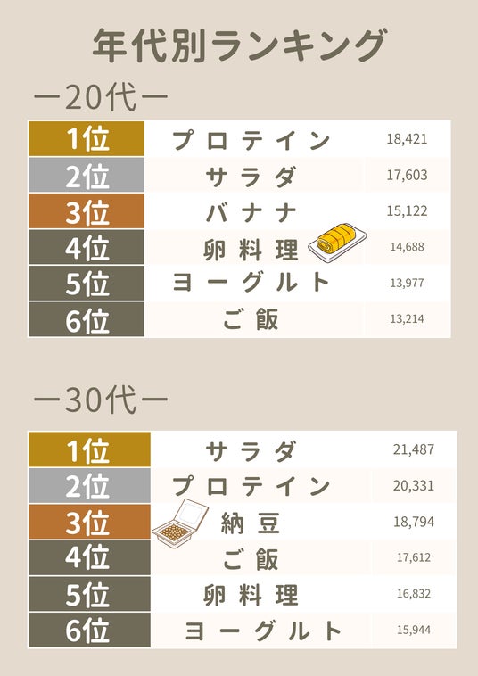 やっぱり日本人の心のふるさと、「ごはん」が堂々の1位!日常食としての根強い人気を示しています。特に近年は、玄米や雑穀米など健康志向のバリエーションも増え、再評価の波が来ているようです。そして、手軽でヘルシー、アレンジ自在なサラダが2位にランクイン。最近では、コンビニや外食でもバリエーションが豊富になってきています。また、かつてはアスリートの専売特許だったプロテインが、筋トレブームや健康志向の高まりを背景に今や一般層にも浸透していることが読み取れます。4位には健康食材として評価されている納豆、5位には栄養価の高さで不動の人気を誇る卵がランクインしました。