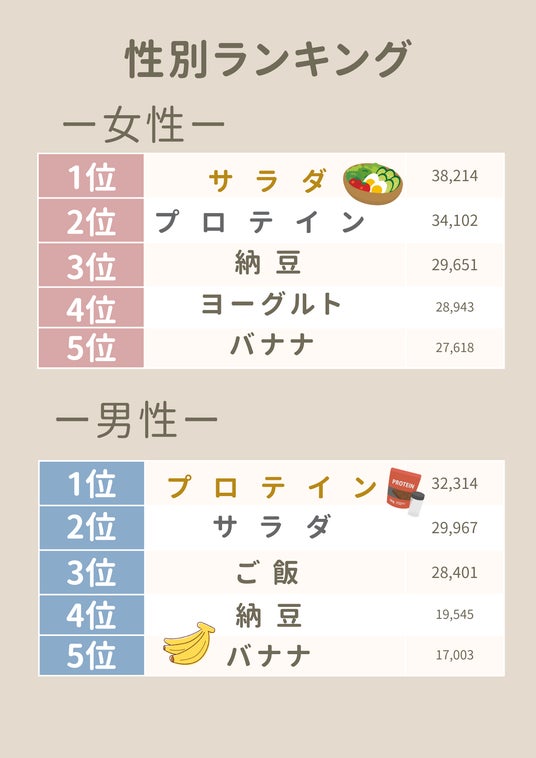 続いて、性別・年代別のランキングを発表していきます!同じ「人気食品」でも、誰がどんな目的で食べているのかを見ていくと、現代の食生活の多様性が浮かび上がってきました。