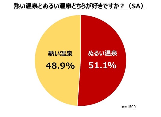 温泉の温度について好みを聞いたところ、「ぬるい温泉」派(51.1%)と「熱い温泉」派(48.9%)と好みがほぼ五分五分の結果となりました。