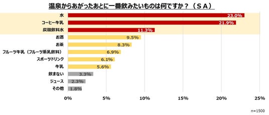 温泉からあがったあとに一番飲みたいものTOP3は、第1位「水」(23.0%)、第2位「コーヒー牛乳」(21.9%)、第3位「炭酸飲料水」(11.3%)という結果になりました。温泉や銭湯における瓶でのドリンク提供が減りつつある一方で、「お風呂あがりといえばコーヒー牛乳」というイメージは健在であることが分かりました。