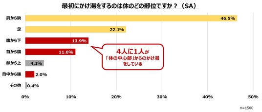 1.最初に“かけ湯”をする体の部位を質問したところ、およそ4人に1人(26.9%)の人が、ヒートショック※のリスクがある「体の中心部」からかけ湯をしている という実態が明らかに。