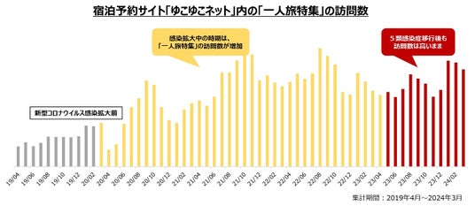当社が提供している宿泊予約サイト「ゆこゆこネット」内の「一人旅特集」の訪問数は、コロナ禍以降増加傾向にあり、新型コロナウイルス感染症が5類感染症に移行された後も、コロナ禍以前より高い水準を維持しています。調査結果からも、温泉宿自体に一人で行く「一人泊」に対するニーズが高まっていると推察されます。長らく、温泉旅行は家族や友人同士で楽しまれる方が多い傾向にありましたが、コロナ禍での密回避をきっかけに、一人泊の魅力に目覚めた方も多いでしょう。