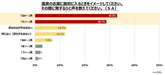 2.“温泉のお湯に最初に入るときに発するひと声“は、「はぁ~」系(33.0%)と「ふぅ~」系(28.7%)が主流。また、女性は「はぁ~」系(特に40代)が多く、男性は「ふぅ~」系(特に50代)が多いという新たな傾向も。