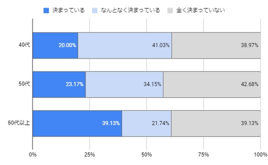 60代以上では、「全く決まっていない」と答えた方が「決まっている」と答えた方と同じ割合まで引き上がっています。