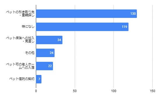 「自分が絶対最後までペットを世話すると言う考えから特に準備をしていませんでしたが、この質問にあって考えようと思いました。確かに不慮の事故などに遭遇する可能性もありますので、その時どうするか現実に考えていこうと思います。」(50代女性)