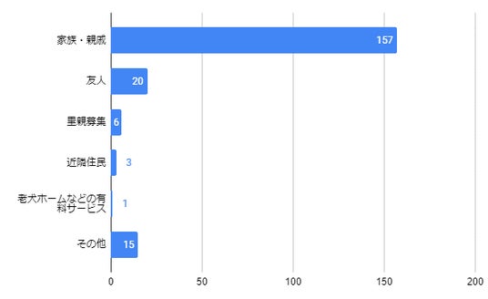 ペットの引き取り先が「決まっている」「なんとなく決まっている」と答えた方には、詳しい引き取り先についても調査したところ、「家族・親戚」が圧倒的に多い157票という結果となりました。