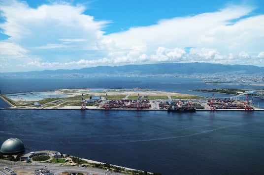 来年開催の「大阪・関西万博」の会場となる夢洲を船から眺める特別航路
