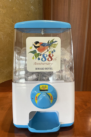 2階フロントに、88周年記念グッズやホテル宿泊券などが当たる「88(ハチハチ)ガチャ」を設置しています。