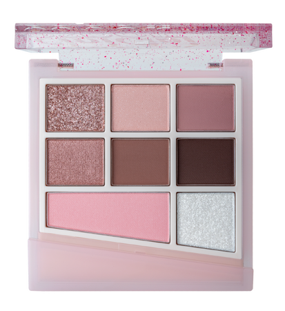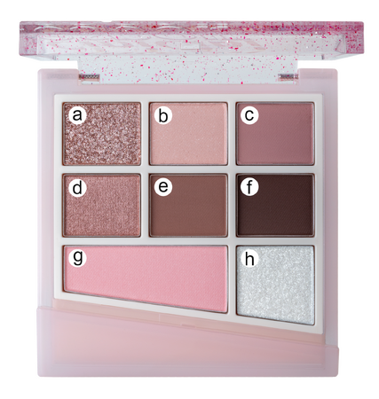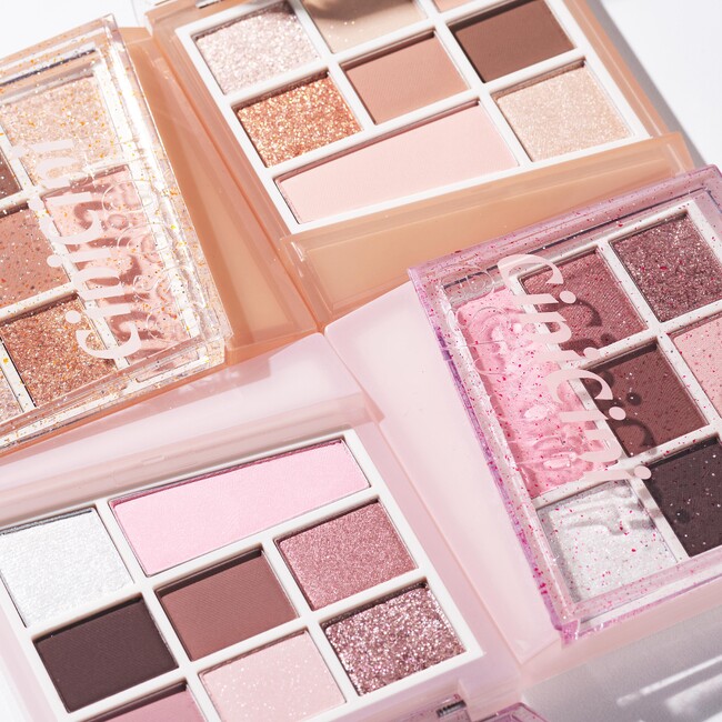 マット、シマー、グリッターと質感の異なるアイシャドウに、ブラッシャー(左下)、ハイライト(右下)を加えた活用度の高い構成。これ一つでカラーメイクが完成。