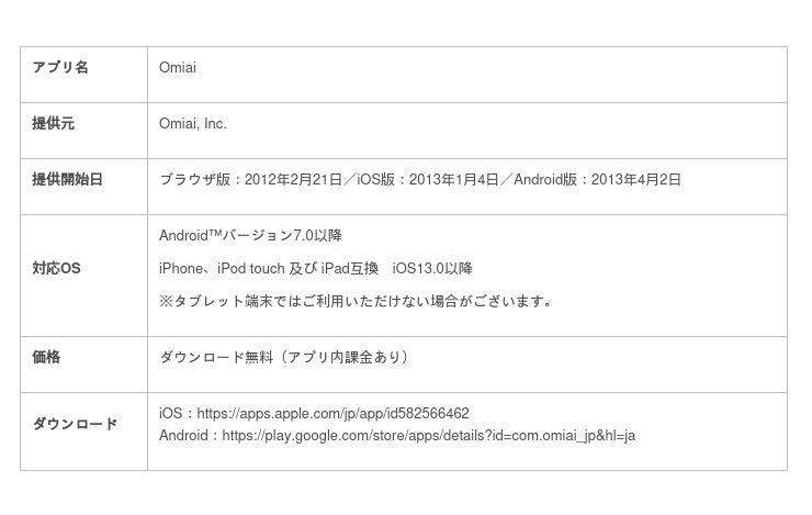 『Omiai』は、婚姻率低下や少子化といった社会課題を背景に、2012年2月に国内でサービス提供を開始した男女の出会いをサポートするマッチングアプリです。サービス開始以降、出逢いを探す多くの男女に支持され、これまでの累計会員数は900万人を超えました(*)。「一般社団法人結婚・婚活応援プロジェクト(MSPJ)」に参画し、業界全体の活性化にも取り組んでいるほか、多くの方の幸せ探しに貢献できるよう、顧客に寄り添ったサービス運営を行ってまいります。*2023年2月時点