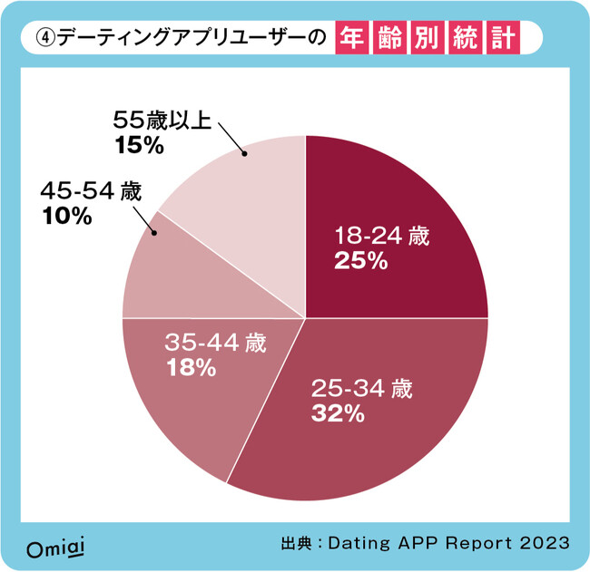 デーティング利用率が最も高いのは、どの年齢層なのでしょうか。Business of Appsが2022年に実施した「ユーザーの年齢別 統計」(グラフ4.)のデータを見ると、25歳~34歳が32%と最も利用率が高く、18歳~24歳が 25%で後に続きます。アプリによって多少のバラつきはあるものの、世界の主要デーティングアプリは成人~34歳までをメインターゲットにしていることがわかります。 この傾向は日本においても変わりなく、世界標準と言えそうです。