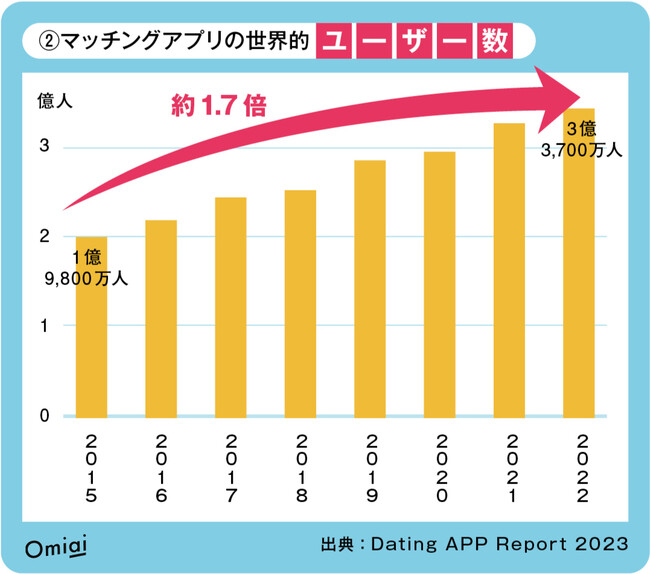 イギリスのアプリ調査会社Business of Appsのレポートによると、マッチングアプリ(欧米ではデーティングアプリと呼ぶのが一般的)の2022年の世界市場規模は49.4億ドルに達しました。2015年(16億ドル)から約3倍に膨らみ、世界中に3億3,700万人のユーザーがいると報告されています。市場拡大の背景には、効率よく条件に合う相手を探したいという傾向が世界的に強まってきたこともありますが、IT技術やAIの進化も大きな影響を与えています。