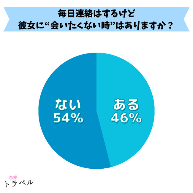 全国の20代~50代の男性100名に彼女に連絡は返すけど“会いたくない”と思ったことがあるか、アンケートを取った結果46%の男性が経験したことが『ある』と回答しました。
