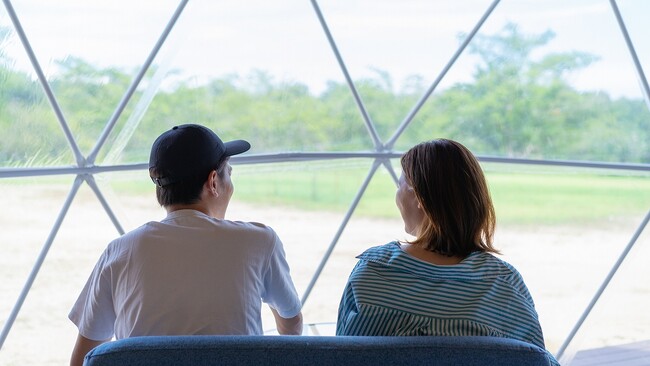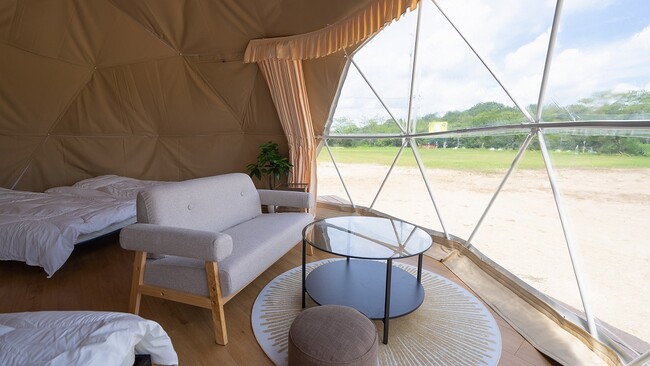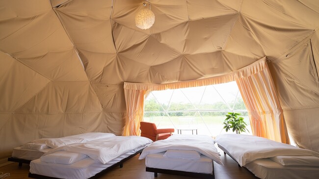 ドームの窓からはグラウンドとしても利用されていた広大な土地が広がっており、グランピング宿泊者はドーム目の前のグラウンドでフリスビーなどで体を動かしたり、思いのままにのんびりくつろぐことができます。