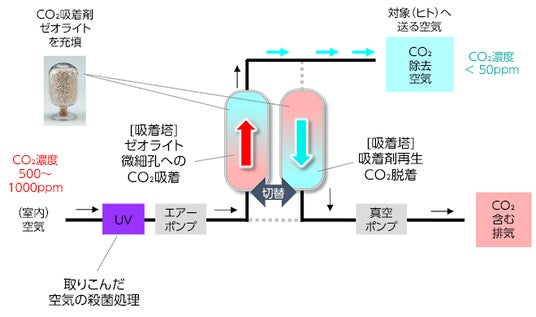 この度開発した装置(図1 装置外観及び仕様)は、室内空気質(IAQ)の向上を目的とした装置で、CO2を効果的に吸着及び除去する吸着剤ゼオライトを利用した、PSA(VSA)(※3)方式によるCO2低濃度化システムと紫外線による空気除菌システム(図2 システム構成概略図)を搭載しています。