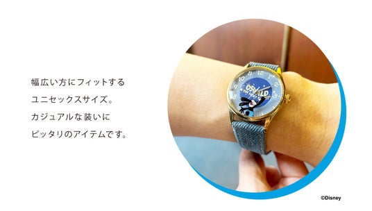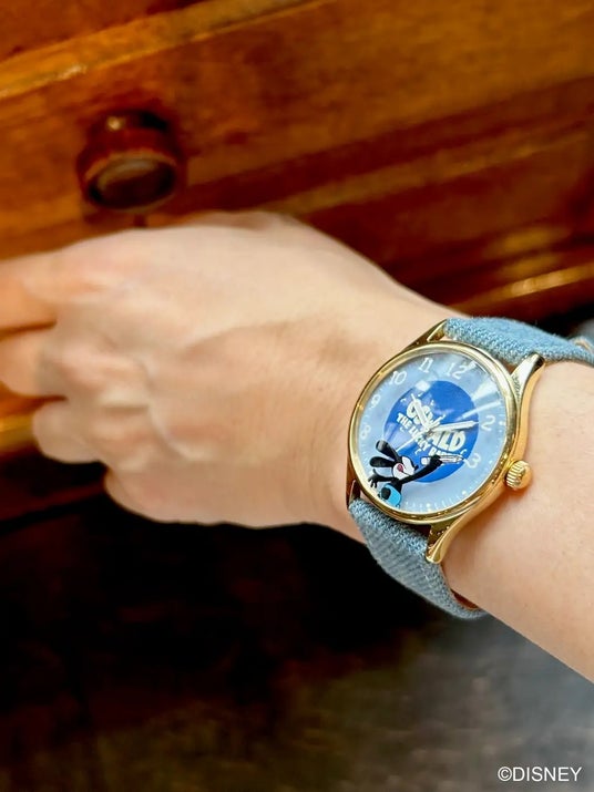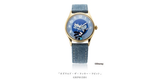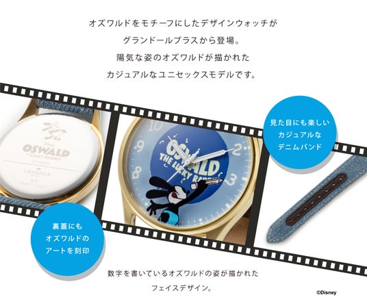 時計から飛び出してダイヤルを描く、ガラスプリントされたオズワルド。GRANDEUR PLUS+がアニメーションの世界観を基にその自由な遊び心を表現した、カジュアルなデニムバンド腕時計。