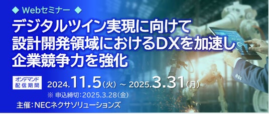 NECネクサソリューションズ株式会社は、「デジタルツイン実現に向けて 設計開発領域におけるDXを加速し企業競争力を強化」セミナーを2025年3月31日(月)までオンデマンド配信いたします。お申し込みは3月28日(金)まで受け付けています。