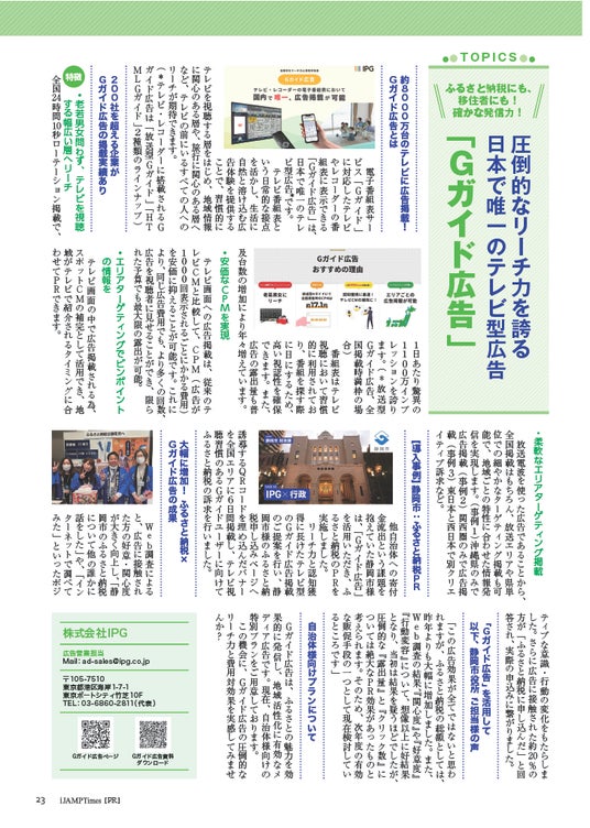 株式会社IPG(本社:港区、代表取締役社長:岡本賢人、以下「IPG」)が提供する「Gガイド広告」に関する記事が、時事通信社の発行する自治体職員向け情報雑誌「iJAMPTimes」(2025年6月18日発刊)に掲載されました。また、本記事のWeb版も「iJAMPTimes」ポータルサイトにて公開されました。