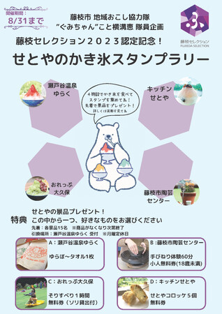 藤枝セレクション2023認定の「せとやのかき氷」が今夏も登場。瀬戸谷地区の4つの活性化施設で地元の特産を使用し、趣向を凝らしたかき氷を販売します。また、回遊性を高め、交流人口や経済効果の拡大を図るため、地域おこし協力隊の横溝恵隊員がスタンプラリーを実施します。