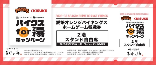 今回販売するチケットは、愛媛オレンジバイキングスの「観戦チケット」と喜助の湯「入浴無料」が付いたチケットです。