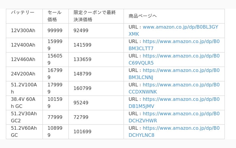 容量300Ah以上のLFPバッテリーに限定クーポンあり