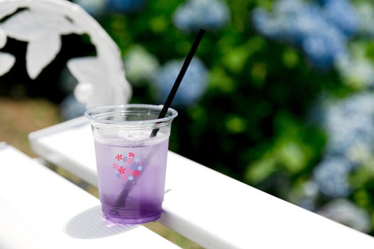 紫色のソーダにレモンシロップを加えると色があじさいのように変化するソーダです。