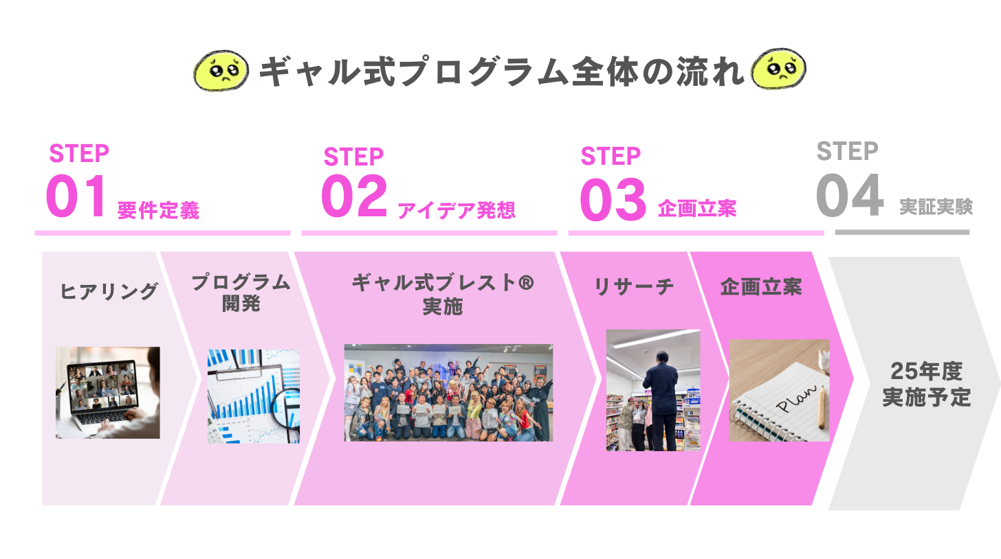 ギャル式ブレスト(R)︎を起点に、コンビニエンスストアでの体験設計・企画提案までを一気通貫で行 い、「商品を買う」から「体験を楽しむ」へと顧客価値を転換する新しい施策を創出。2025年度には 実証実験フェーズへの展開を予定しています。