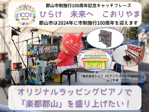 福島県郡山市は、2024年に市制施行100周年を迎えます。この記念すべき年を契機とし、音楽の力で地域を盛り上げるべく、本市初となるガバメントクラウドファンディング(R)を活用し、オリジナルラッピングピアノを製作するプロジェクトを開始しました。