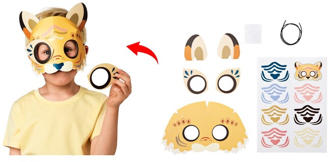 フライングタイガーから出ました!じぶんだけのタイガーマスクが作れるキット!顔のベースに耳と目と好きなカラーの模様を貼りつけて。ちょっと立体のおしゃれなマスクの出来上がり。