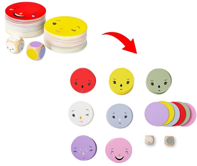 表情と色のサイコロを2つ投げて、一緒の組合せをさがそう!多くとった人が勝ち!