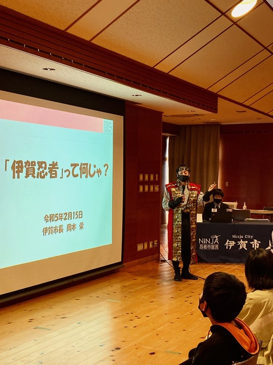 忍者市市長による市内小学校での出前授業郷土愛を育むと共に将来へ向けたまちづくりへの意識の醸成を図るため、また、郷土の文化である「伊賀流忍者」を子ども達に知ってもらうために、毎年行っています。今年は2月15日に上野東小学校の6年生児童を対象に、『伊賀忍者ってなんじゃ?』と題し、伊賀忍者が誕生した理由や、実際に使用されていた忍術の紹介など、リアルな忍者について忍者市市長による出前授業をします。