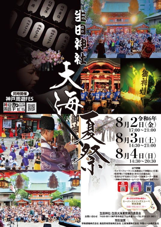 8月2日(金)・3日(土)・4日(日)、神戸市中央区にある生田神社にて『大海夏祭』が開催されます。大海夏祭とは、生田神社境内の南側に位置し、海運守護、道開き、交通安全の神である猿田彦命を祀る大海神社で開催されるお祭りで、2023年度より早駒運輸株式会社の代表取締役社長・渡辺真二が実行委員長を務め、今年もステージでの音楽フェスや、スポーツ体験ブース、DJブースや屋台など数々のコンテンツで暑い夏を盛り上げます。