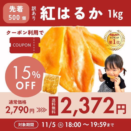 11/5(火)『訳あり紅はるか干し芋 1kg』で使える2時間限定15%OFFクーポン