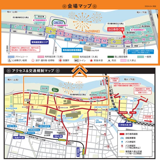昨年の火災事故の検証結果を踏まえ、観覧者が安心して花火を楽しむことができる体制でお届けします。会場の対岸の戸田橋花火大会と同日開催し、大会史上最多の約15,000発(戸田橋花火大会含む)の花火が夜空を美しく彩り、見た方に感動をお届けします。